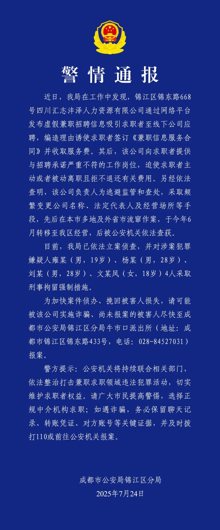 近日,我局在工作中发现,锦江区锦东路668号四川汇志沣泽人力资源有限公司通过网络平台发布虚假兼职招聘信息吸引求职者至线下公司应聘,编造理由诱使求职者签订《兼职信息服务合同》并收取服务费。其后,该公司向求职者提供与招聘承诺严重不符的工作岗位,迫使求职者主动或者被动离职且拒不退还有关费用。另经依法查明,该公司负责人为逃避监管和查处,采取频繁变更公司名称、法定代表人及经营场所等手段,先后在本市多地及外省市流窜作案,于今年6月转移至我区经营,后被公安机关依法查获。